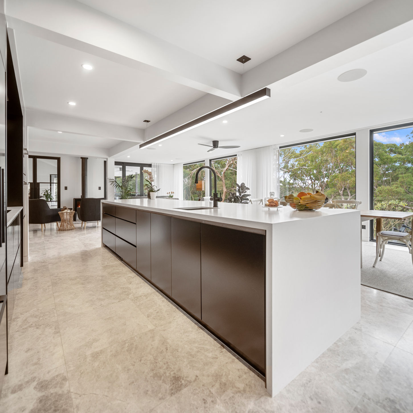The renovation features a contemporary new kitchen, refreshed living spaces, and an inviting outdoor area — all designed to connect seamlessly and create a natural hub for entertaining. A considered transformation that brings new life to a tranquil setting.